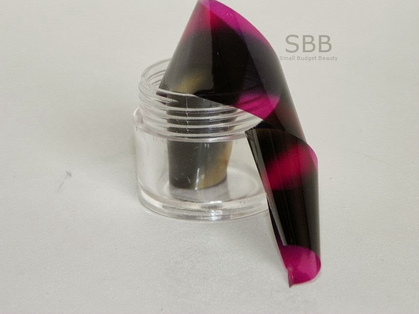 With the roll of foil I also received a small bottle of adhesive to use with it. The foil alone costs $6.92 if you want a bottle of glue with it the cost is $8.86 (small bottle) or $10.80 (larger bottle). Basically you are supposed to 'paint' your nail with this adhesive, wait for it to dry a little, so it's tacky then you place the foil over your nail and use your finger to smooth out the foil. When you lift the foil sheet off your nail it should have transferred to it and give you a really cool looking nail.